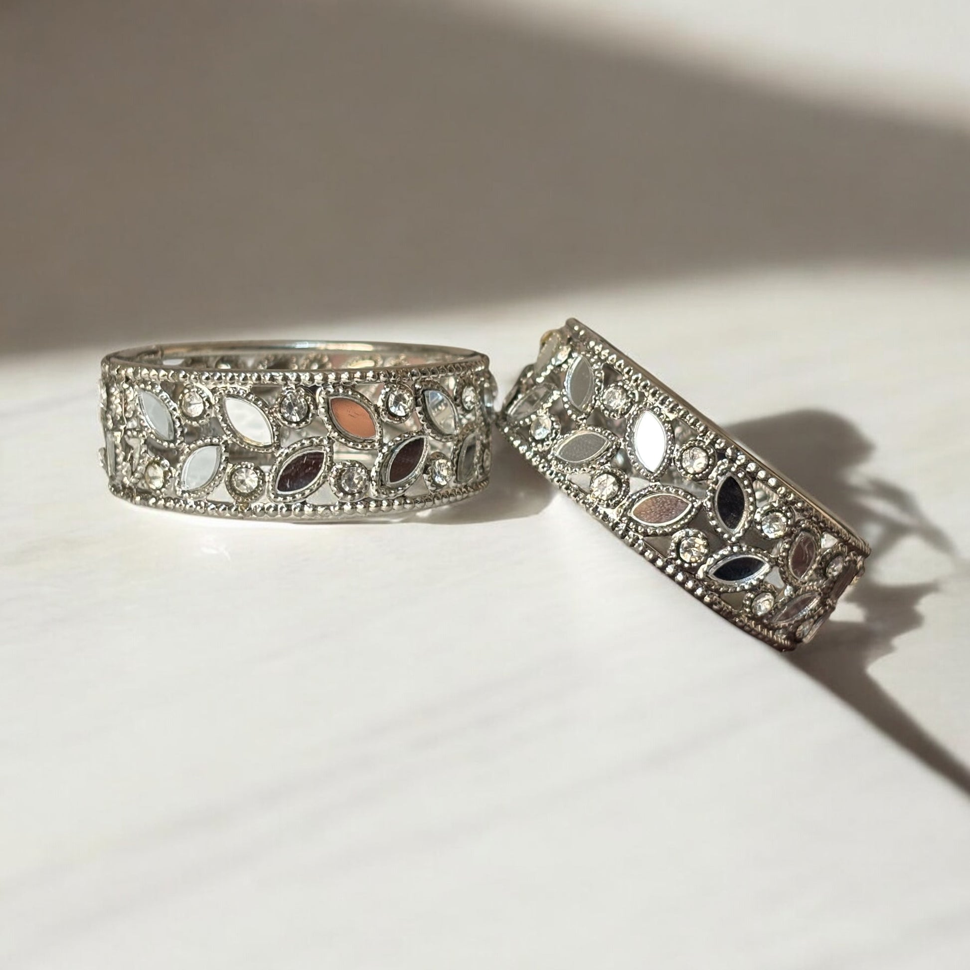 Antique Silver Mirror Work Bangles – Leaf Motif with Crystal Accents